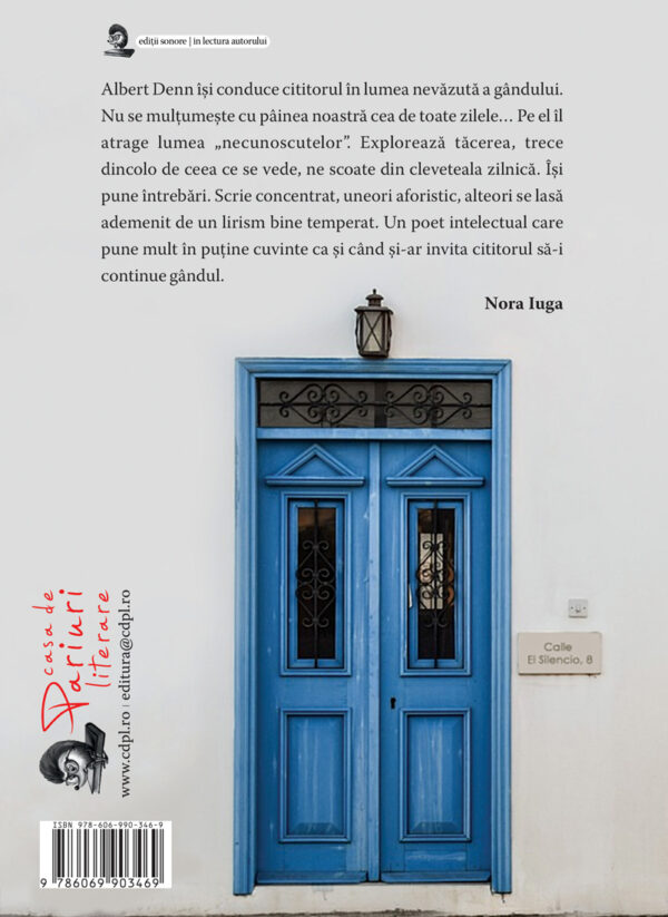 (…) Albert Denn pare să se simtă bine în ascunzătoarea tăcerilor lui, fiindcă nu poţi vorbi cu tine însuţi decît fără cuvintele cu care te adresezi altora. La adăpostul controlului cerebral se simte protejat. Nu sunt critic literar, dar această involuntară formă de masochism poetic este un semn care-l distinge de toţi poeţii tineri pe care i-am citit în ultima vreme. Asta e natura lui, originalitatea lui, umbra lui. Nu ştiu cum va primi critica actuală acest nou fel de a privi, de a gîndi realitatea, viaţa, iubirea, ca un palimpsest, ca un palton purtat pe dos, făcînd voluptuoase orgii cu ideile, cu tăcerile, ceea ce nu prea fac tinerii în ziua de azi. (…) – Nora Iuga
